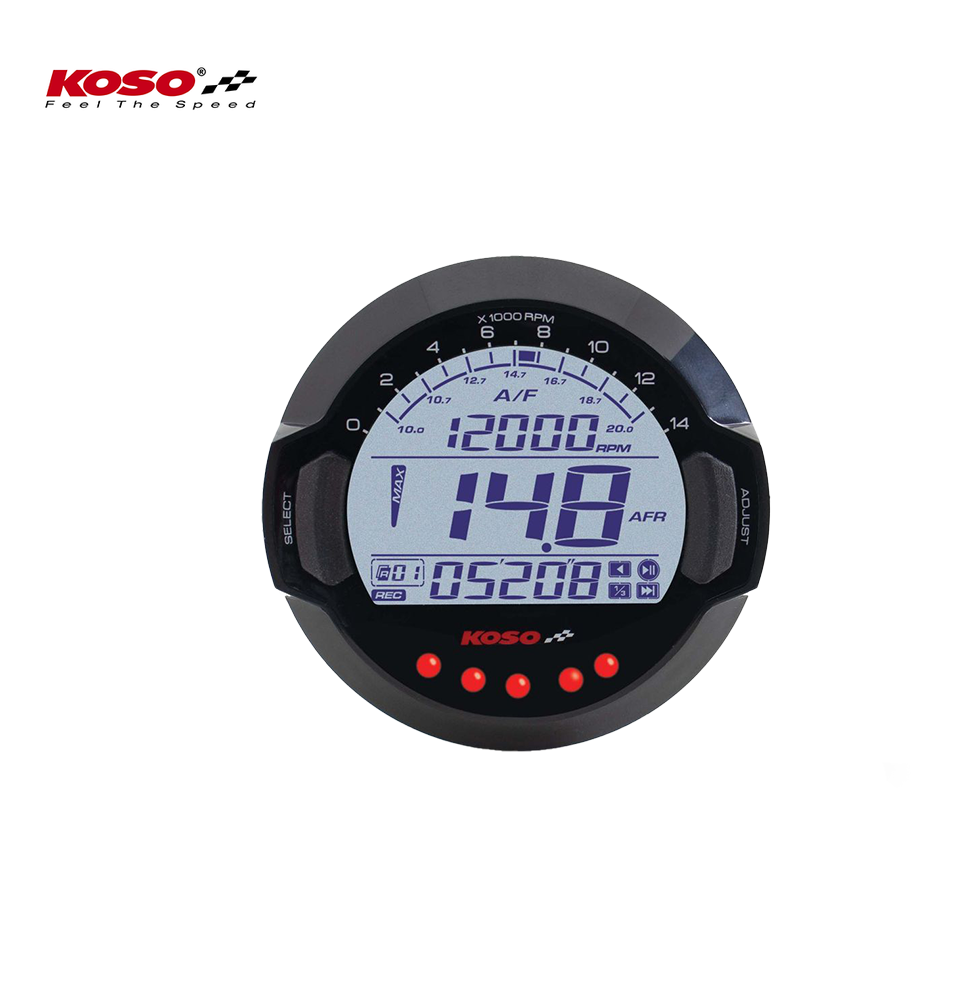 The Koso DL-03A with BOSCH® LSU 4.9 sensor displays the air-fuel ratio, has a speed data memory and can optimize driving performance thanks to the associated playback capability. A tachometer, digital voltmeter and 5 different LED signal lights are also integrated.